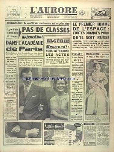Amazon - AURORE (L') [No 5135] du 10/03/1961 ~ noté /5. retrouvez aurore (l') [no 5135] du 10/03/1961 - enseignants - le conflit des traitement est au plus aigu - algerie - masmoudi dit nous attendons les actes - le 1er homme de l'espace - peut-etre un russe - les policiers manquaient l'arrestation des ravisseurs de peugeot - kathy la fiancee du duc de kent - haag - president-directeur du cnl - va etre inculpe - bouguiba aux etats-unis le .